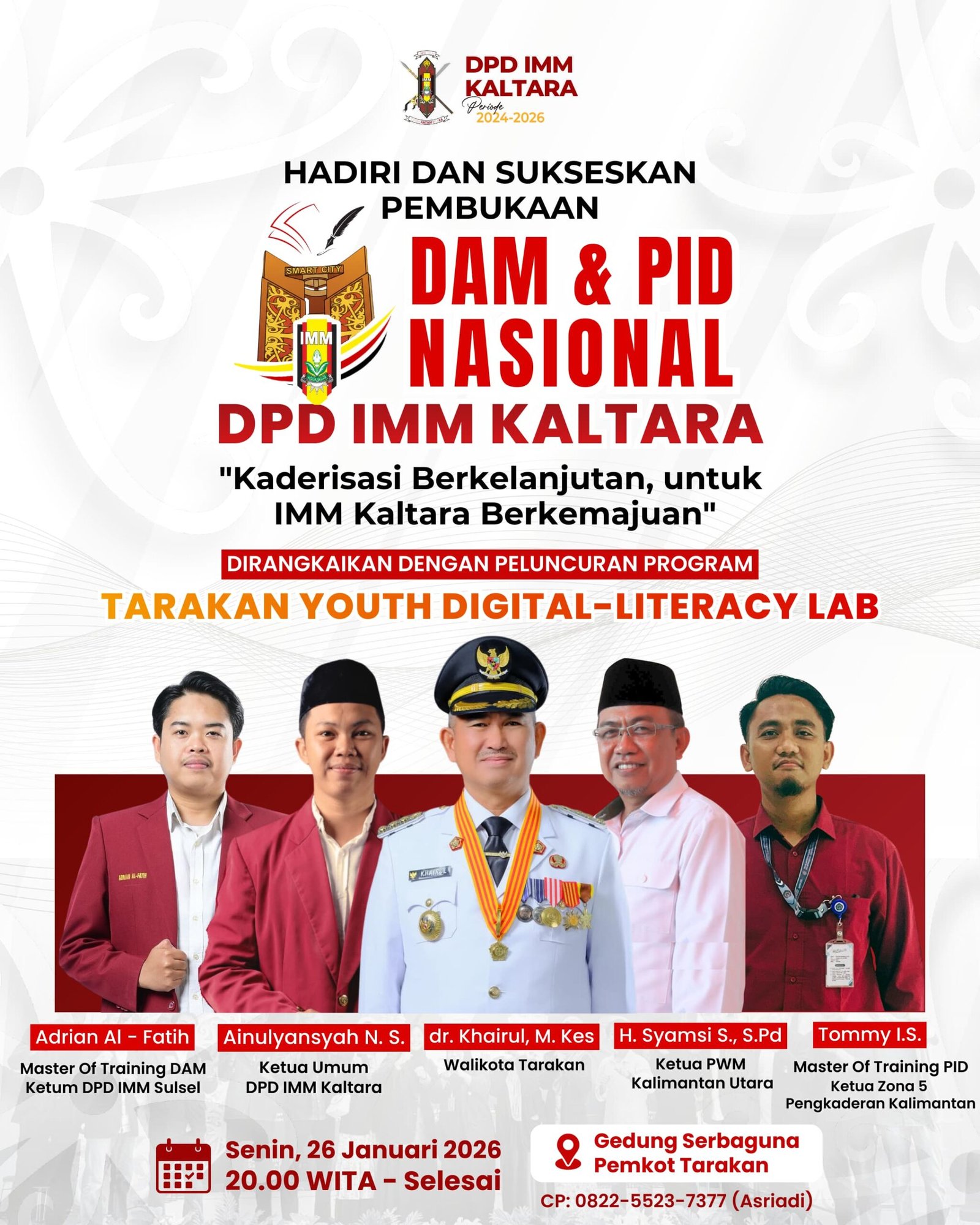 TARAKAN – Dewan Pimpinan Daerah Ikatan Mahasiswa Muhammadiyah (DPD IMM) Kalimantan Utara akan menggelar agenda nasional Darul Arqam Madya (DAM) dan Pelatihan Instruktur Dasar (PID) yang berpusat di Bumi Paguntaka, kegiatan ini akan dibuka pada Senin malam (26/1/2026). Kegiatan tersebut dijadwalkan berlangsung di Gedung Serbaguna Pemerintah Kota Tarakan mulai pukul 20.00 WITA hingga selesai.